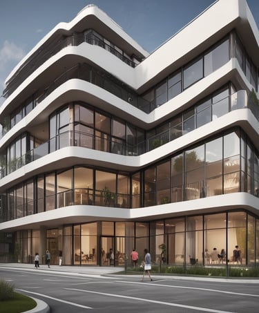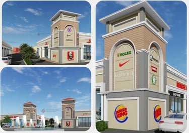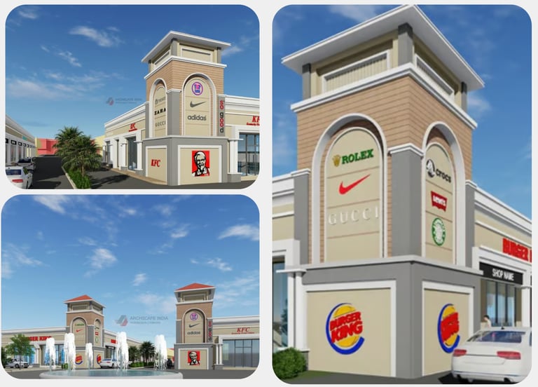 High-impact commercial exteriors and a highway retail hub featuring a grand architectural entrance and optimised storefront visibility