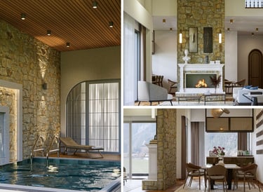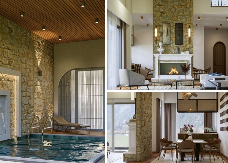 This interior design seamlessly blends rustic and modern aesthetics by pairing textured stone walls with warm wooden slat ceilings and neutral furnishings.