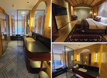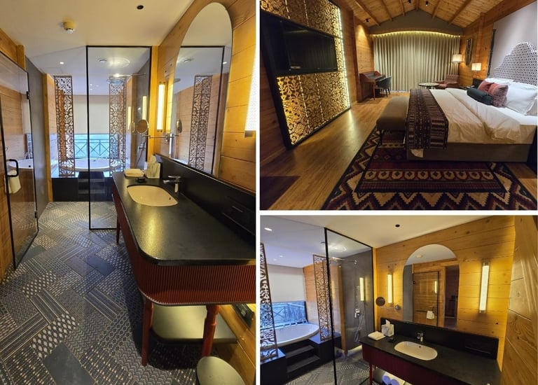 Luxury hospitality with timeless design.The design of these spaces utilizes warm wood paneling and intricate geometric screens to create a culturally rich and inviting atmosphere
